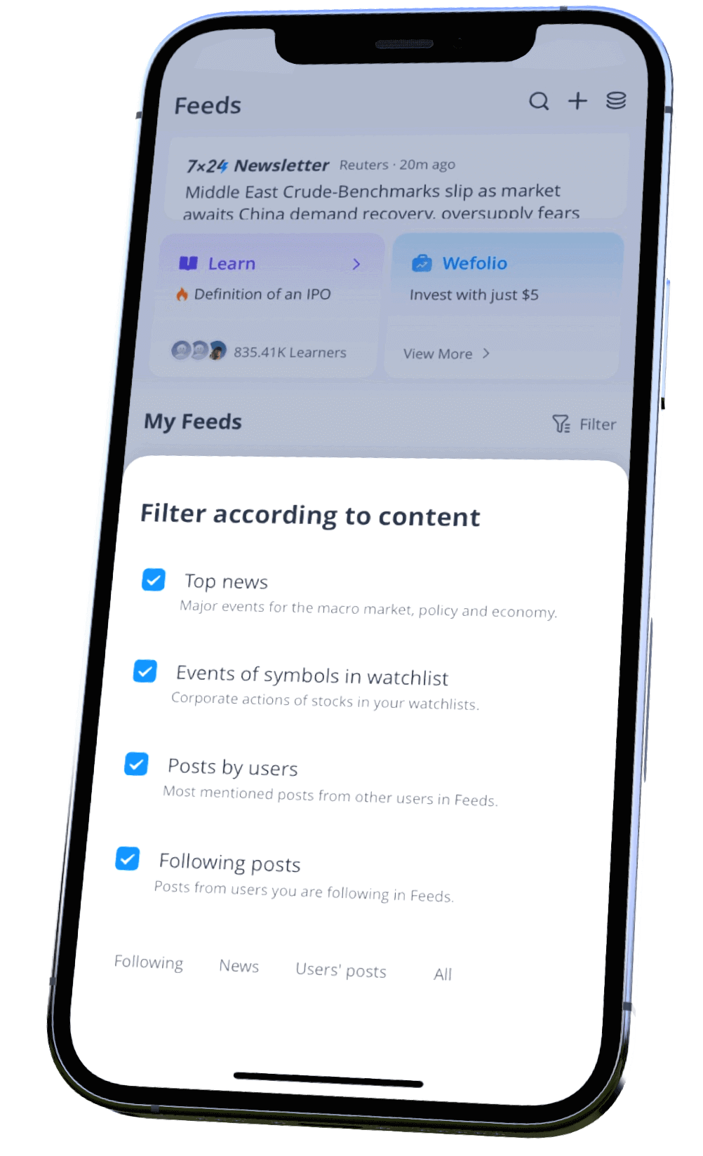 Stay up-to-date with current market trends with feeds, news, events, and posts about the markets. Customizable filters allow you to focus on certain content or category!